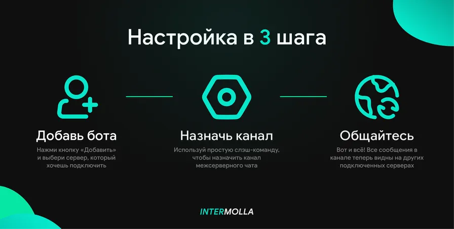 Надоел ограниченный круг общения? InterMolla — это бот, который создает единый чат между десятками разных серверов! Находи новых друзей, обсуждай игры, аниме или ищи тиммейтов с тысячами пользователей, не покидая любимое комьюнити.