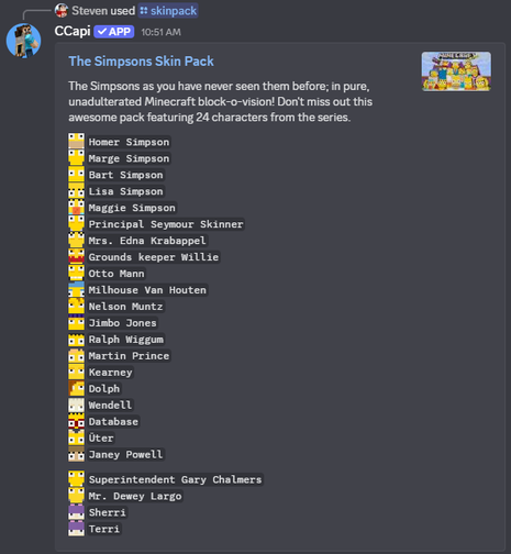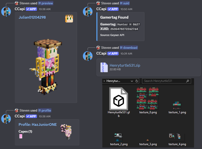 Hey! I'm CCapi, a simple, fast, and reliable bot for previewing and downloading Minecraft Bedrock player skins.