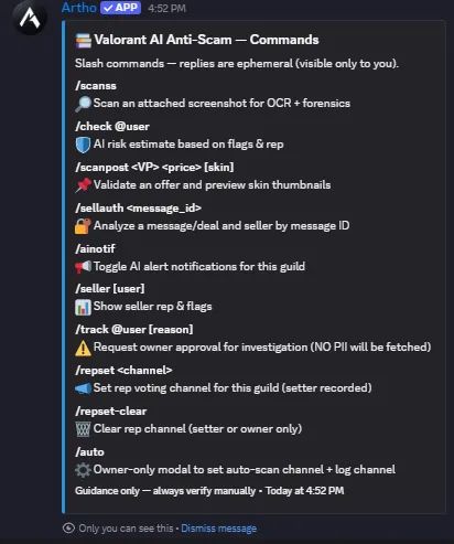 🔐 Artho - Is AI Integrated Anti-Scam Bot for Valorant Sellers/Buyers - real time scam detection across mutual servers, screenshots, and offers!!
