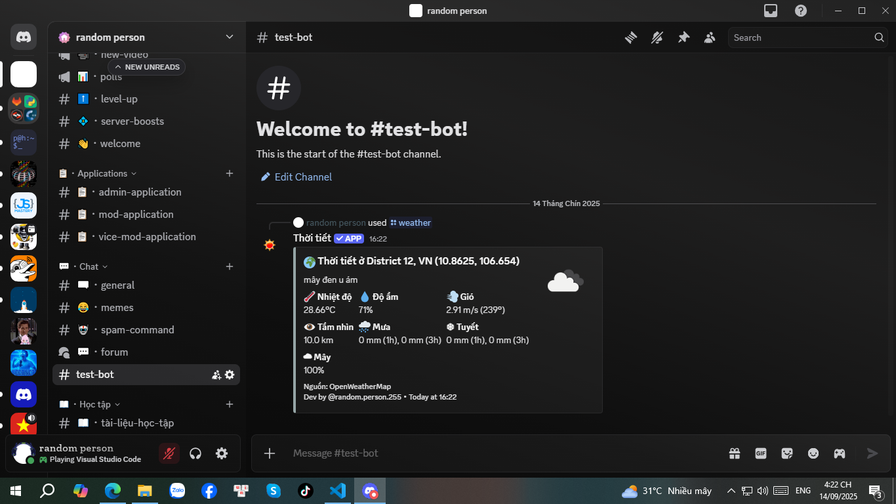 Bot chỉ hỗ trợ tiếng Việt (This bot only support Vietnamese) Một ứng dụng thời tiết, fetch dữ liệu thời tiết từ OpenWeatherMap và Open-Meteo. Được lập trình bởi @therealnhan