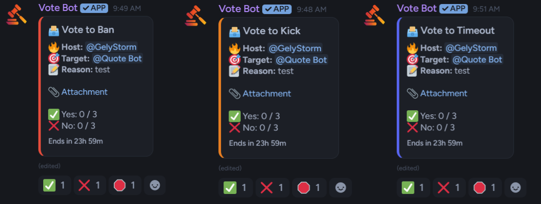 - Kick, ban, or timeout users based on voting.