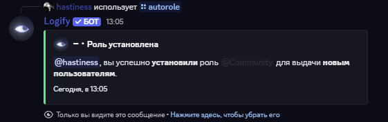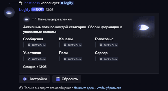 Добавьте бота, используйте /logify для настройки и наблюдайте за событиями.