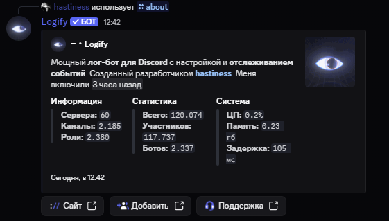 Logify — многофункциональный бот для Discord, помогающий администраторам контролировать сервер. Отслеживает присоединение и выход участников, изменения сообщений, ролей и каналов.