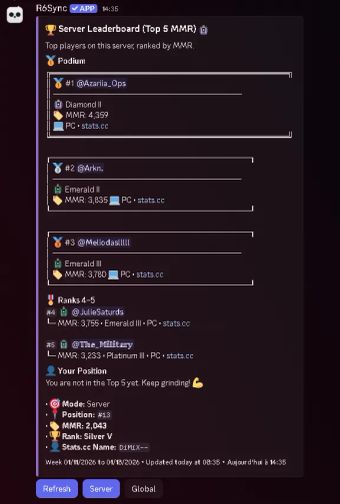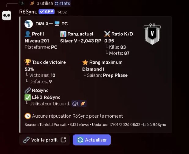 Powered by Stats.cc, R6Sync delivers fast, accurate, and reliable data, allowing players to track their progression, showcase their performance, and enabling administrators to keep their server organized, consistent, and fully automated—with zero manual effort.