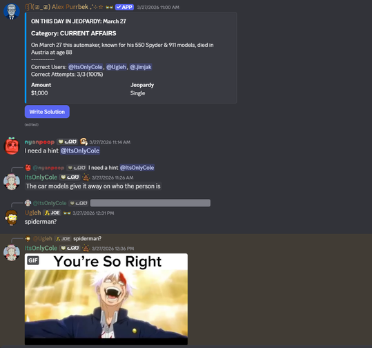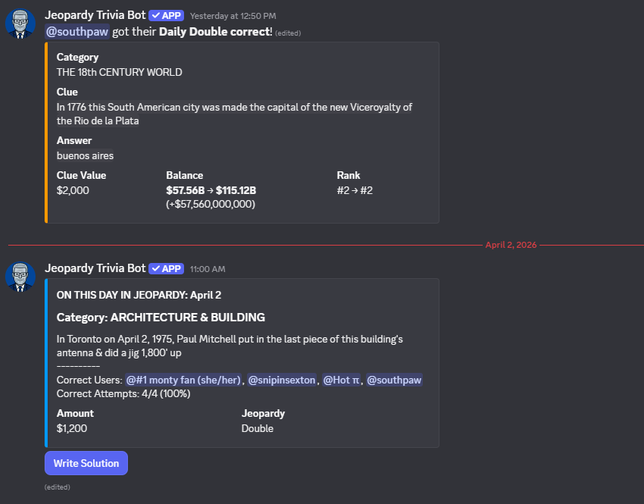 A fully automated, daily trivia game inspired by the classic TV show — right in your Discord server. Answer questions about what happened that day in history.