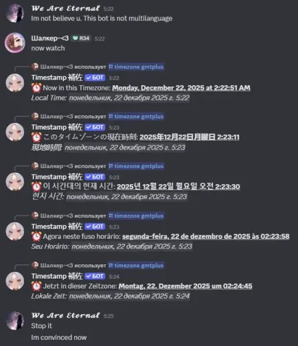 Timestamp 補佐 is a Discord Bot / User App that allows you to create any timestamps for embedding in your messages, use a date calculator, calculate the time elapsed from one date to another, randomize date, game dice or integer, and convert dates from UNIX format to a readable format and vice versa! Currently supports 11 languages: Русский, Українська, English, Français, Polski, Svenska, Deutsch, 日本語, Português (Brazilian), 한국어, Български.