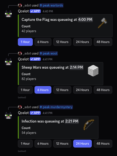 Qcelot is a Discord bot that monitors per-game player counts on the Hypixel network in real-time. Qcelot can watch specific games and send automatic notifications to configured channels when player counts reach certain thresholds, set per-server defaults to simplify repeated queries, and check current and peak player counts on demand. Whether you're waiting for a Farm Hunt game to queue or AP hunting in Quakecraft, Qcelot keeps you updated.