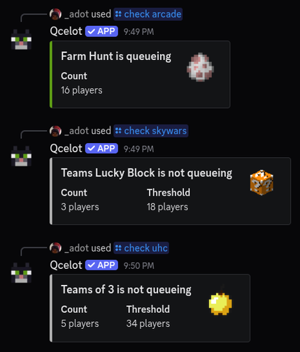 Qcelot is a Discord bot that monitors per-game player counts on the Hypixel network in real-time. Qcelot can watch specific games and send automatic notifications to configured channels when player counts reach certain thresholds, set per-server defaults to simplify repeated queries, and check current player counts on demand. Whether you're waiting for a Farm Hunt game to queue or AP hunting in Quakecraft, Qcelot keeps you updated.