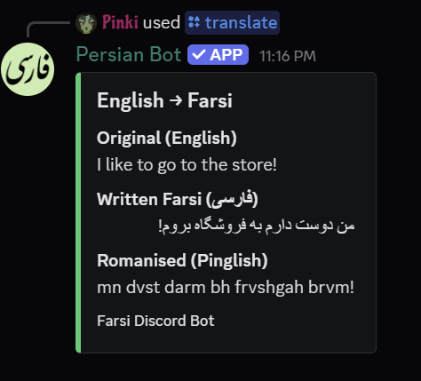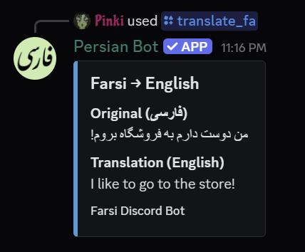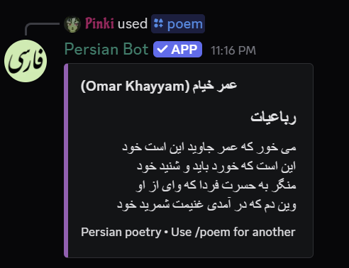 Translates English ↔ Farsi, shows Persian poetry, Hafez fortunes, proverbs, and facts about Iran. Use /translate, /poem, /hafez, /proverb, /iran and more to learn the Iranian language, culture, and literature!