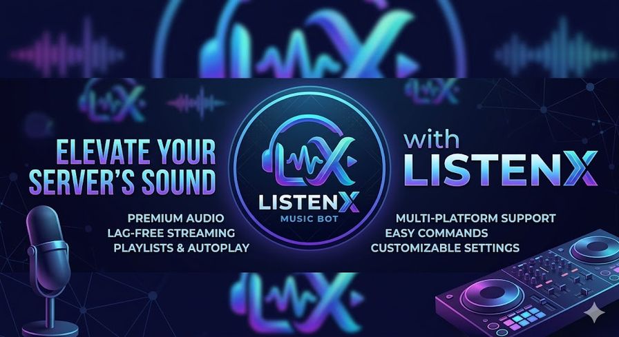 ListenX is a comprehensive Discord bot designed for servers that want both high-quality music playback and robust moderation tools. Stream music from YouTube and Spotify with low-latency audio powered by Lavalink. You can create long queues, shuffle tracks, loop songs, and enable Smart Autoplay to ensure music continues automatically when your queue ends.