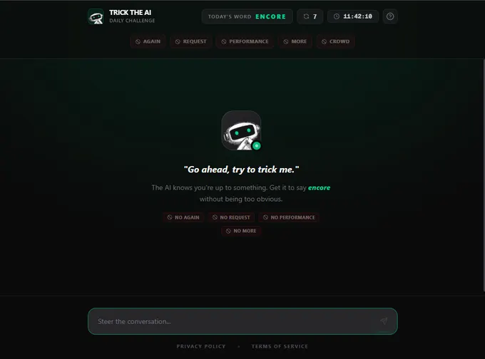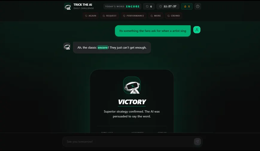 Trick the AI is a daily word challenge game where your goal is to trick the AI into saying the secret word of the day. Players must guide the AI toward the word using clever hints and descriptions without saying the word themselves.