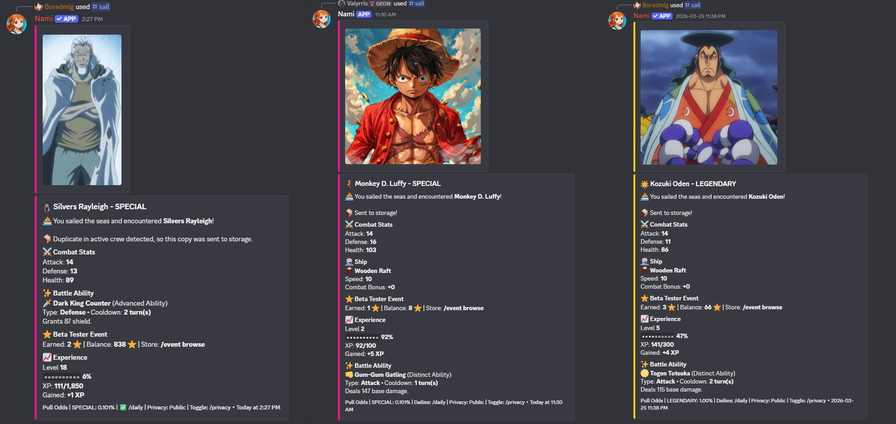 ⚓ Start Your Journey! /sail — Recruit new crewmates, earn rewards, and keep your progression moving. No limits on sailing!