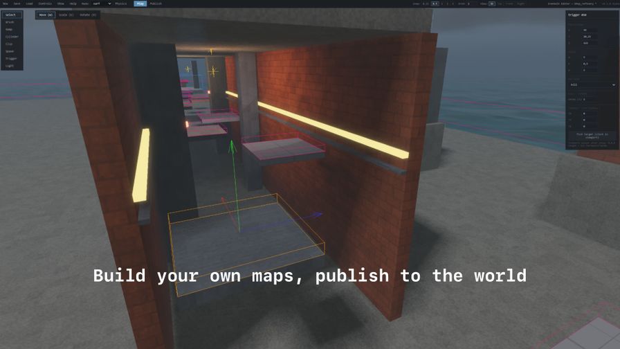 Build Your Own Maps A full 3D map editor right in the browser. Place brushes, ramps, triggers, then publish with one click. Your map gets a code anyone can use to play it instantly.