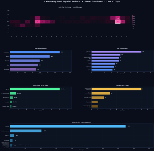 /leaderboardβ top message senders bar chart/activityβ server activity heatmap by hour and day of week/vc-leaderboardβ who spends the most time in voice channels/top-emojisβ most used emojis server-wide/dashboardβ full server overview with all stats in one image