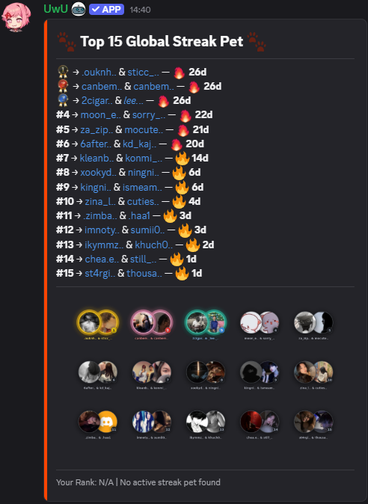 Create or join clans, compete in 5v5 clan battles with individual member point tracking, unlock gold-verified clan status for extra perks, and share custom clan logos across every UwU server.