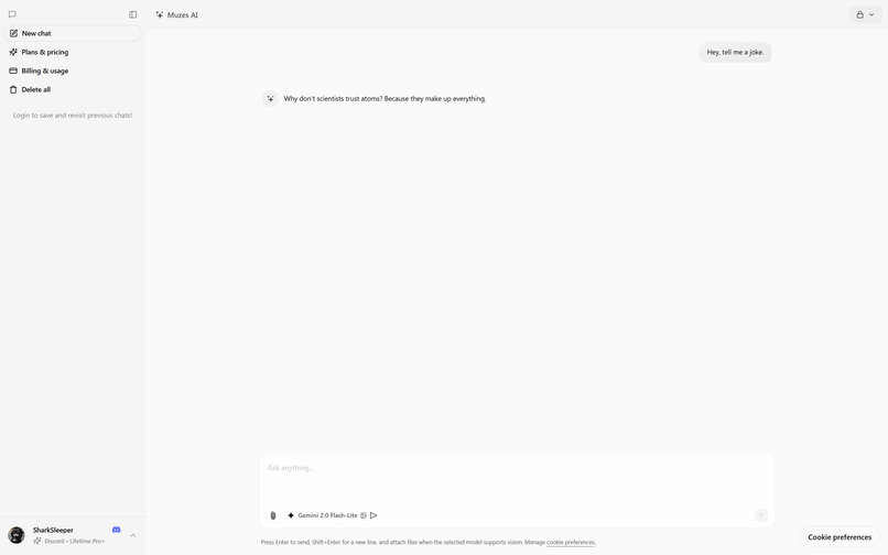Most AI apps give you one model and one chat box. Muzes gives you something bigger: one place to write, code, generate images, work with files, ask practical questions, save private history, and continue the same workflow between Discord and the website.
