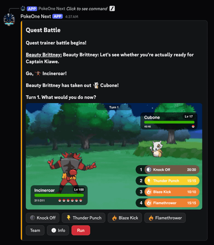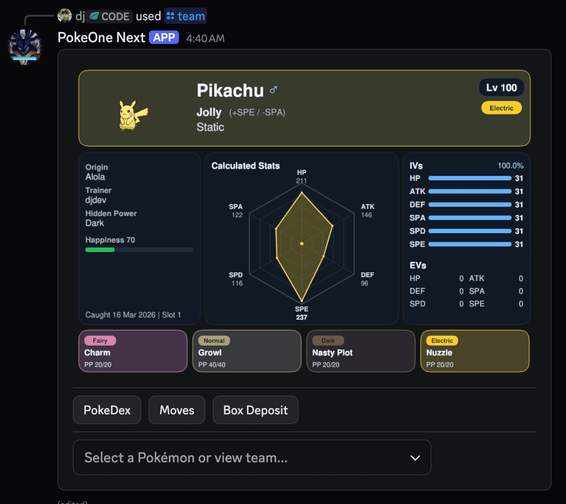 /team | See your team slotView specific Pokémon slot (1-6) |