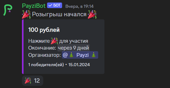 /giveaway | Управление розыгрышами startНачать розыгрыш rerollВыбрать нового победителя endЗакончить розыгрыш раньше времени |