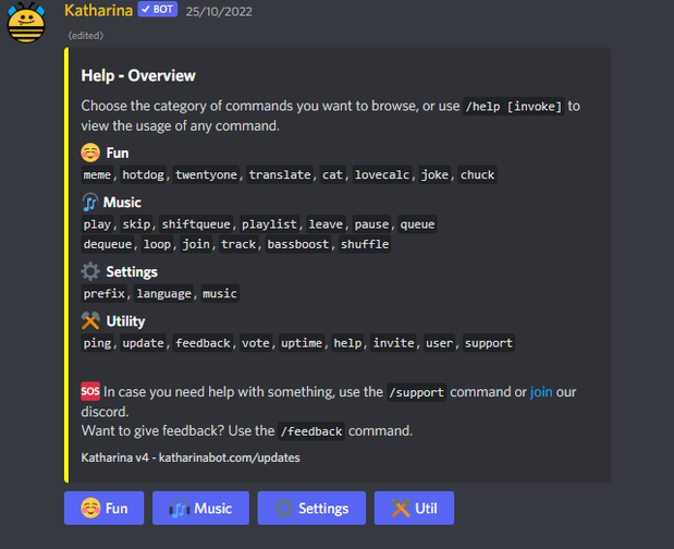 Please not that we just release Version 4.1.0 and some features may contain small bugs. Feel free to report these using the /support command. We are also in active development and are glad for any feedback regarding Katharina. To provide feedback use the /feedback command.