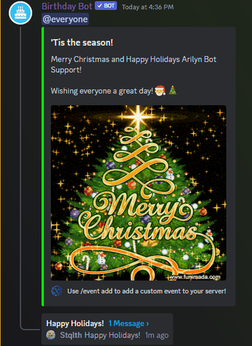 - Custom Event System: Create up to 500 custom events that will be celebrated in your server! Each event has it's own