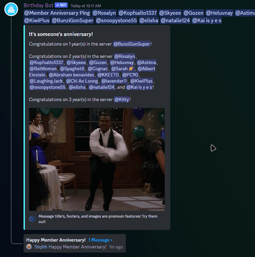 - Up to 500 custom server anniversary messages (vs 1 for free).