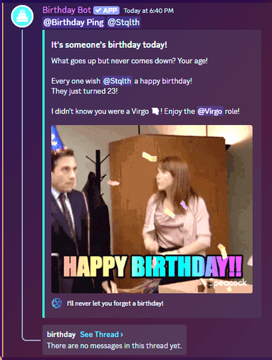 - Set your birthday & time zone with the bot, which allows the bot to know on what day and what time zone to celebrate your birthday.