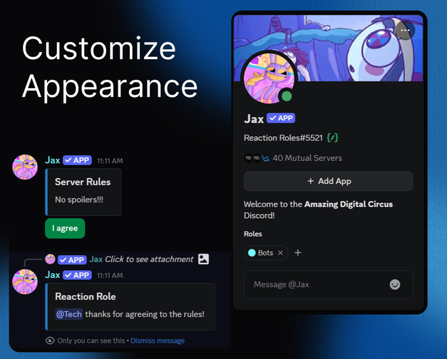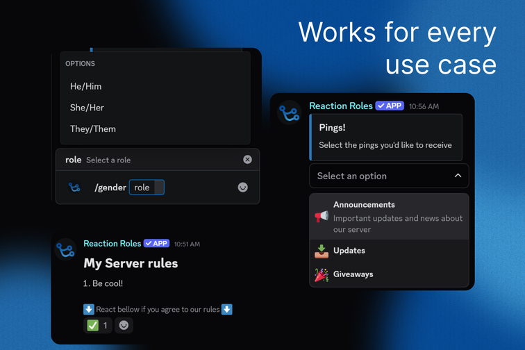 Reaction Roles is a Discord bot that gives users roles when they click on buttons, dropdowns, emojis or use certain slash commands.