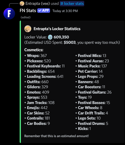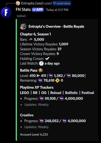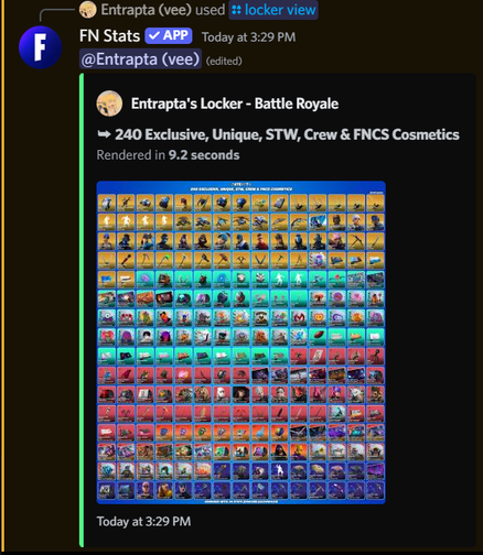 Fortnite companion bot. Link your Fortnite account to me to generate locker images, buy/gift item shop cosmetics, get BR, CR, STW stats, and etc. Support Server: https://discord.gg/GvHfG33 Website: https://fnstats.app
