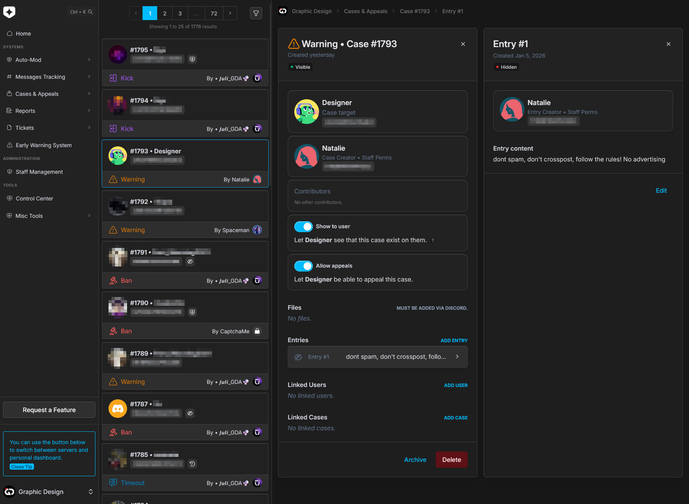 - 🗃️ Powerful Cases & Appeals—Built-in livechat for appeals, attach files to cases, link cases & users together, multiple entires in cases.