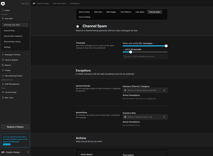 - 🤖 Custom & integrated Auto-Mod—1st party support for Discord auto-mod, with a public library of pre-made rules, in additoin to Archivian's own custom auto-mod that deals with what Discord's auto-mod can't