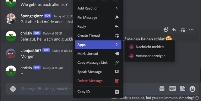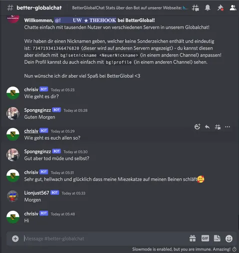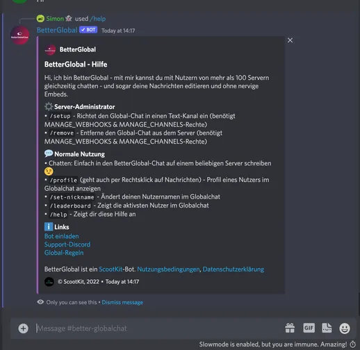 /help: Zeigt alle Befehle des Bots an/setup: Richtet den Globalchat ein/remove: Entfernt den Globalchat/profile: Zeigt dir das Profil von dir oder anderen BetterGlobal-Nutzer an (geht auch via Context-Menü)/set-nickname: Setzt deinen Globalchat-Nicknamen/leaderboard: Zeigt die aktivsten BetterGlobal-Nutzer an