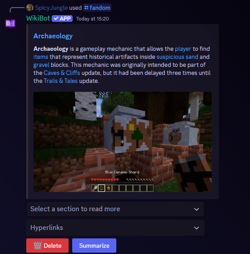 /wikigg | Look up a wikigg page! wikiWhich wiki do you want to look up? pageWhat do you want to look up? briefShould I keep it brief? (Send only the first paragraph) |