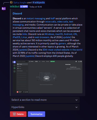 WikiBot is a discord bot created to easily let you look up anything, anytime through simple chat input commands.