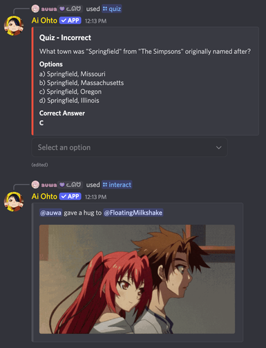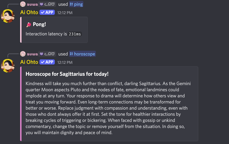 Ai Ohto is a Discord bot that is designed to be a fun and useful bot for your server. It has a wide variety of commands, and is constantly being updated with new features.