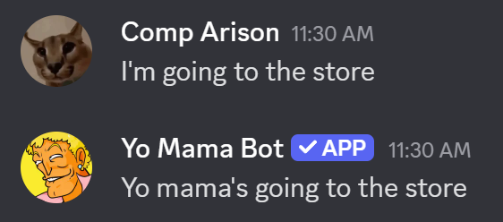 This bot reads chat messages for keywords like "I'm" or "I would" or "I think" and replies with the same message, but makes it about your mother.
