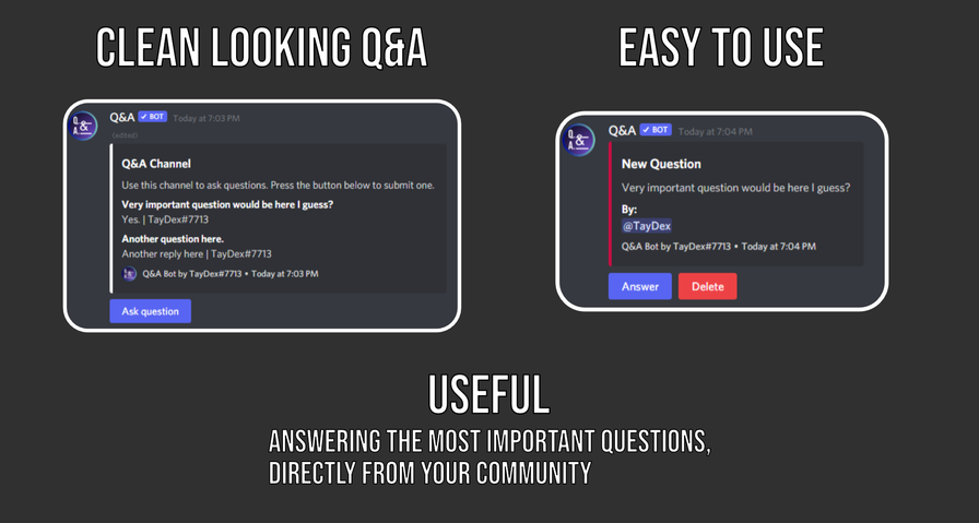 The Bot is the perfect solution for engaging with your community and answering their questions. It directly allows you to build/collect a Q&A made out of questions by your Community. With its easy setup, it's also viable as a Q&A only for a certain Event/short period. The Bot uses Embeds as well as only slash commands and buttons for ease of use and a clean look.
