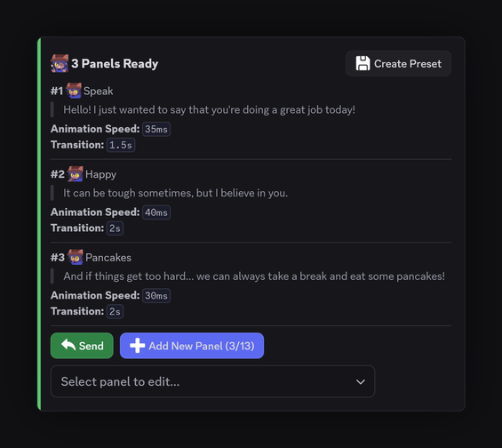 Create animated dialogue boxes just like in the game with /textbox. Customize characters, expressions, and speed to tell your own stories.